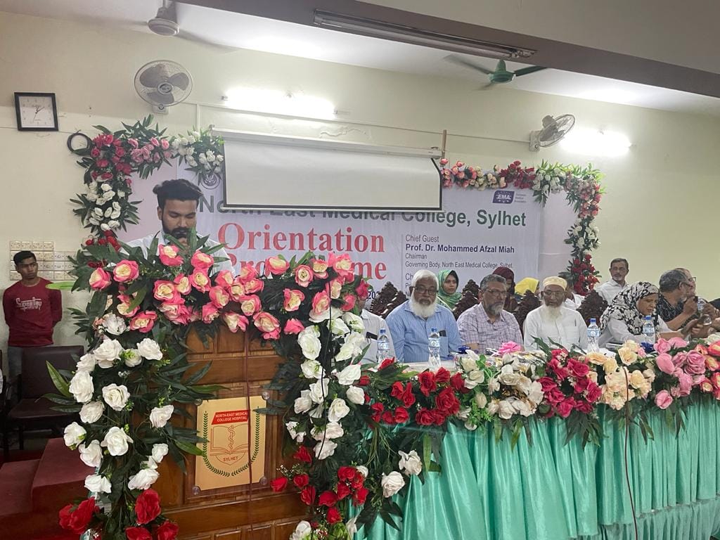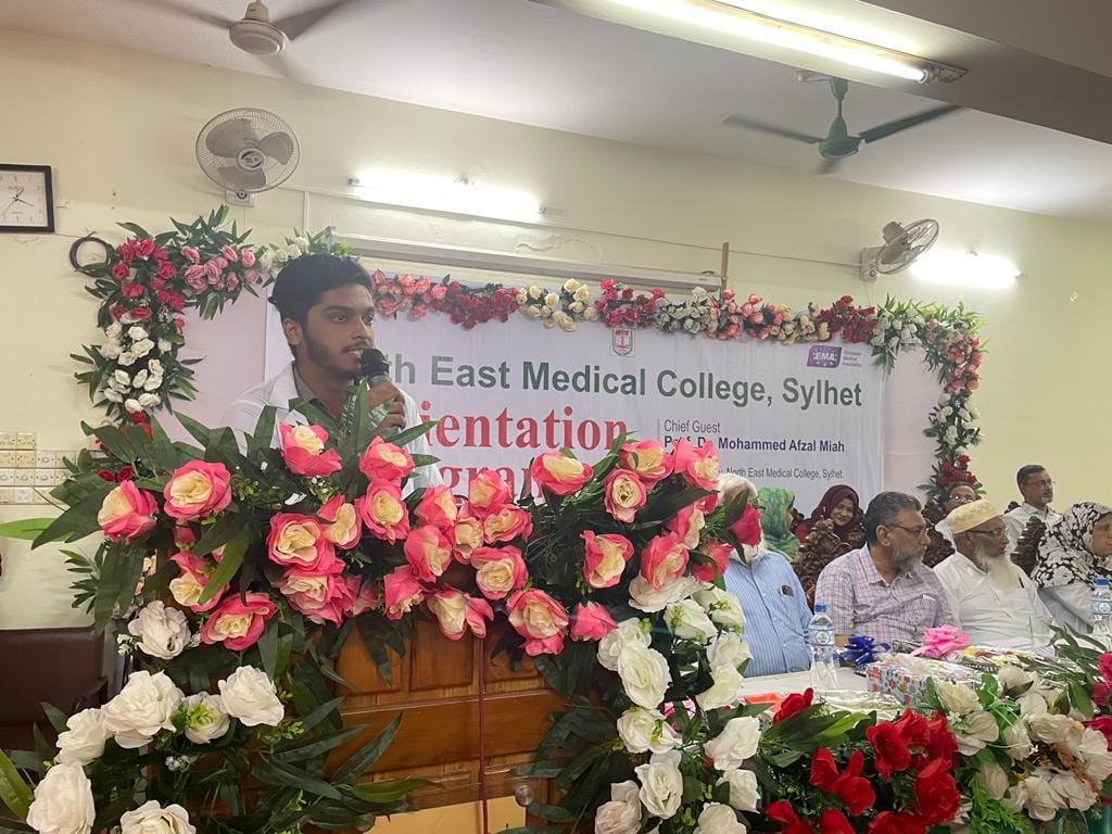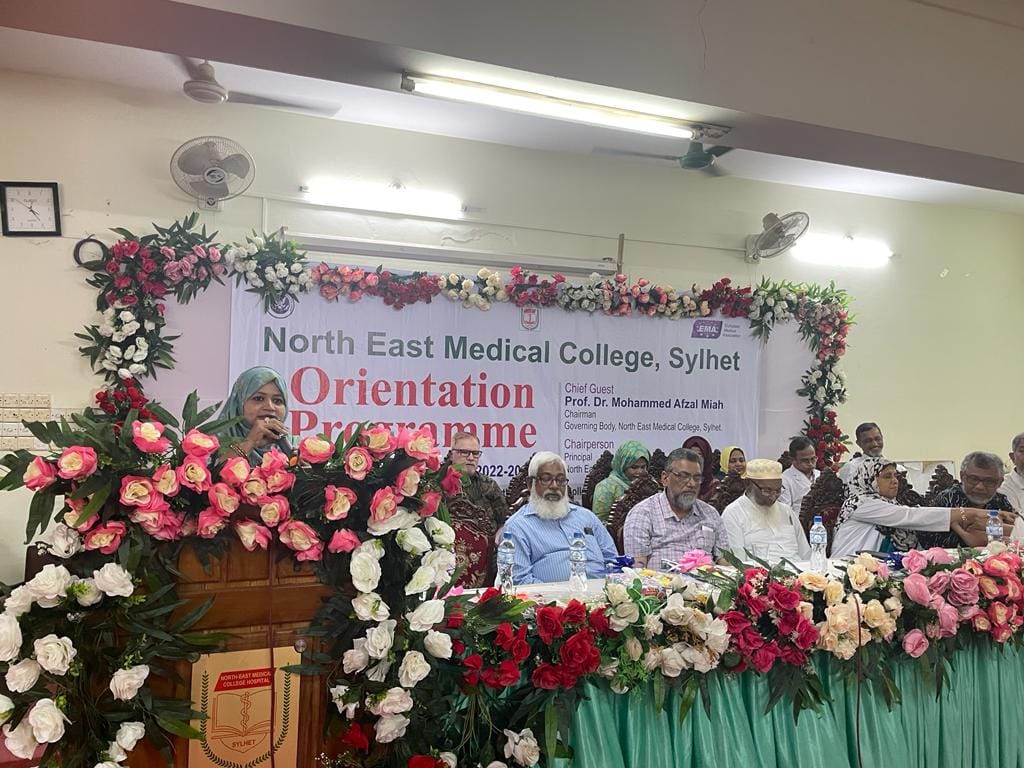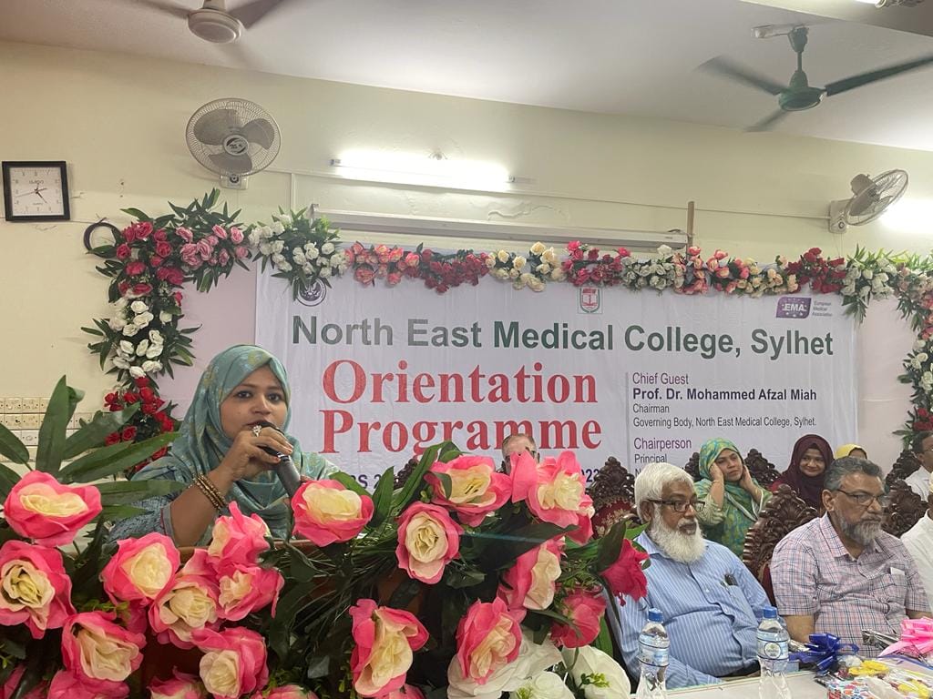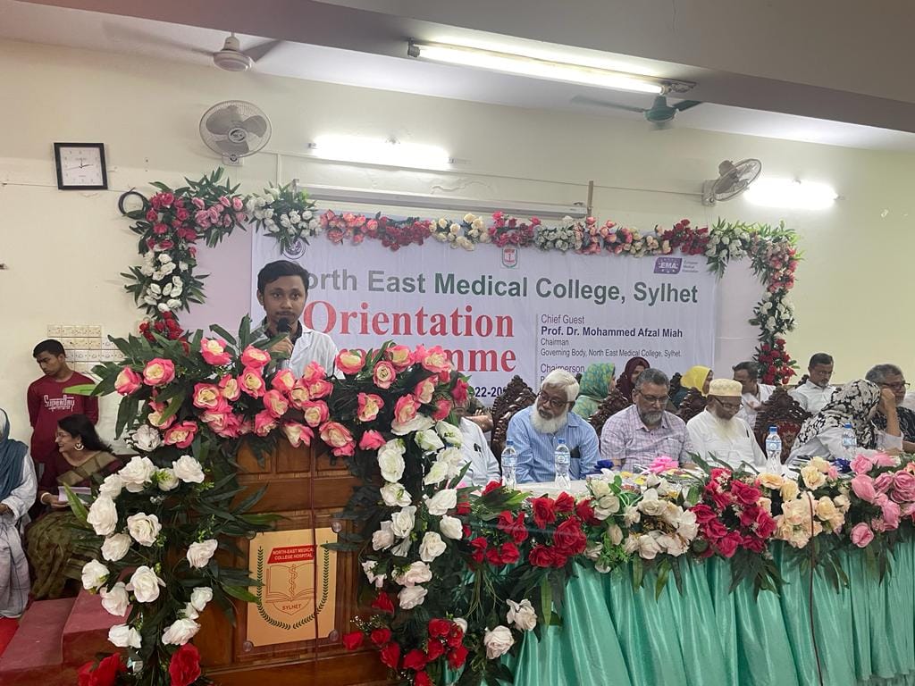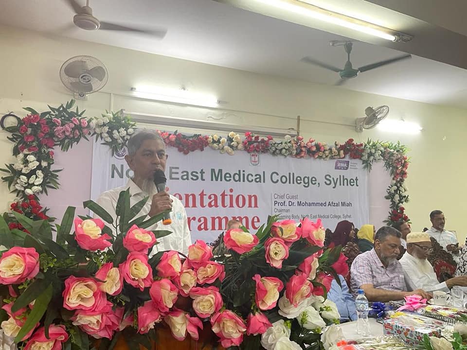 নর্থ ইষ্ট মেডিকেল কলেজ এমবিবিএস কোর্স ২৬তম ব্যাচের নবীনবরণ অনুষ্ঠানে প্রধান অতিথির বক্তব্যে অধ্যাপক ডাঃ মোহাম্মদ আফজল মিয়া, চেয়ারম্যান, গভর্ণিং বডি নর্থ ইষ্ট মেডিকেল কলেজ, শিক্ষার্থীদের উদ্দেশ্যে বলেন প্রতিষ্ঠান হিসাবে তোমরা সেরা প্রতিষ্ঠানকেই বেছে নিয়েছ। নর্থ ইষ্ট মেডিকেল কলেজ চিকিৎসা শিক্ষা ও স্বাস্থ্য সেবায় দেশের গন্ডি পেরিয়ে আন্তর্জাতিক স্বীকৃতি অর্জন করেছে। উক্ত প্রতিষ্ঠানটি বিশ্ব স্বাস্থ্য সংস্থার স্বীকৃতি ও জেনারেল মেডিকেল কাউন্সিল, ইউকে এর তালিকা ভুক্তি সহ ইউরোপিয়ান মেডিকেল এসোসিয়েশন কর্তৃক এওয়ার্ড প্রাপ্ত হয়েছে। এদিক বিবেচনায় চিকিৎসা শিক্ষা প্রতিষ্ঠানটি দেশের সেবা একটি প্রতিষ্ঠান। শিক্ষার্থীদের উদ্দেশ্যে তিনি আরোও বলেন জ্ঞান অর্জনের পাশাপাশি নিয়মানুবর্তিতা জীবনে চলার পথে পাথেয় হয়ে থাকবে। অভিভাবকদের উদ্দেশ্যে তিনি বলেন সময় সময়ে ছাত্র-ছাত্রীদের খোঁজ-খবর নিলে অবশ্যই তারা পাঠদানে মনোযোগী হবে।