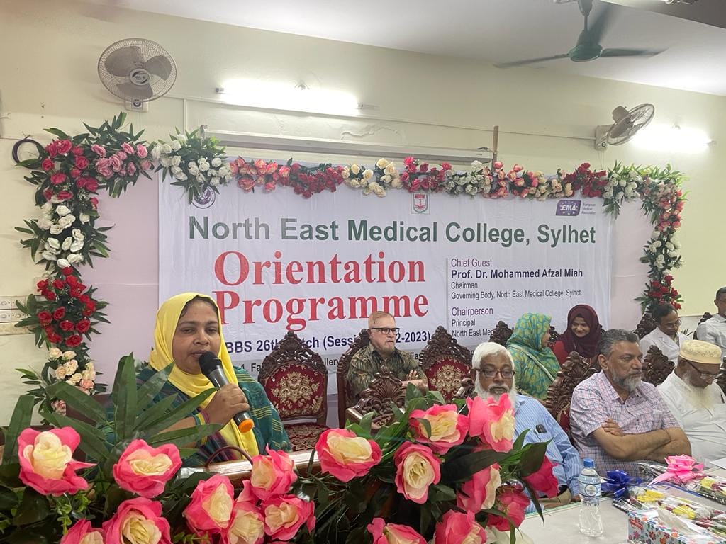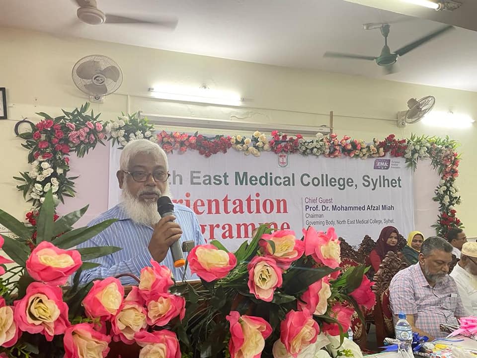 নর্থ ইষ্ট মেডিকেল কলেজ এমবিবিএস কোর্স ২৬তম ব্যাচের নবীনবরণ অনুষ্ঠানে প্রধান অতিথির বক্তব্যে অধ্যাপক ডাঃ মোহাম্মদ আফজল মিয়া, চেয়ারম্যান, গভর্ণিং বডি নর্থ ইষ্ট মেডিকেল কলেজ, শিক্ষার্থীদের উদ্দেশ্যে বলেন প্রতিষ্ঠান হিসাবে তোমরা সেরা প্রতিষ্ঠানকেই বেছে নিয়েছ। নর্থ ইষ্ট মেডিকেল কলেজ চিকিৎসা শিক্ষা ও স্বাস্থ্য সেবায় দেশের গন্ডি পেরিয়ে আন্তর্জাতিক স্বীকৃতি অর্জন করেছে। উক্ত প্রতিষ্ঠানটি বিশ্ব স্বাস্থ্য সংস্থার স্বীকৃতি ও জেনারেল মেডিকেল কাউন্সিল, ইউকে এর তালিকা ভুক্তি সহ ইউরোপিয়ান মেডিকেল এসোসিয়েশন কর্তৃক এওয়ার্ড প্রাপ্ত হয়েছে। এদিক বিবেচনায় চিকিৎসা শিক্ষা প্রতিষ্ঠানটি দেশের সেবা একটি প্রতিষ্ঠান। শিক্ষার্থীদের উদ্দেশ্যে তিনি আরোও বলেন জ্ঞান অর্জনের পাশাপাশি নিয়মানুবর্তিতা জীবনে চলার পথে পাথেয় হয়ে থাকবে। অভিভাবকদের উদ্দেশ্যে তিনি বলেন সময় সময়ে ছাত্র-ছাত্রীদের খোঁজ-খবর নিলে অবশ্যই তারা পাঠদানে মনোযোগী হবে।