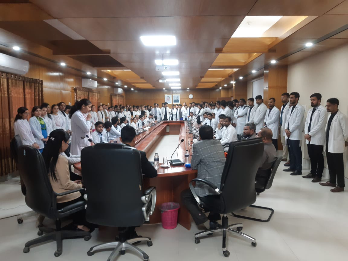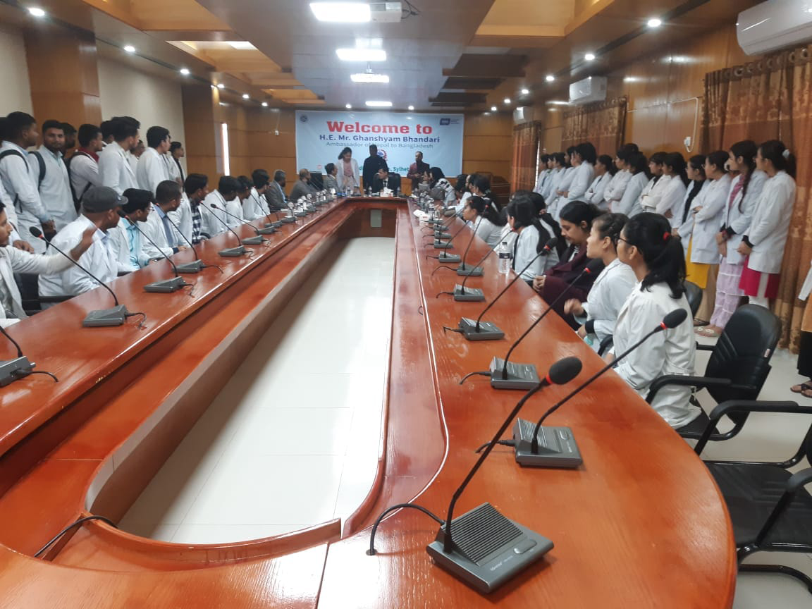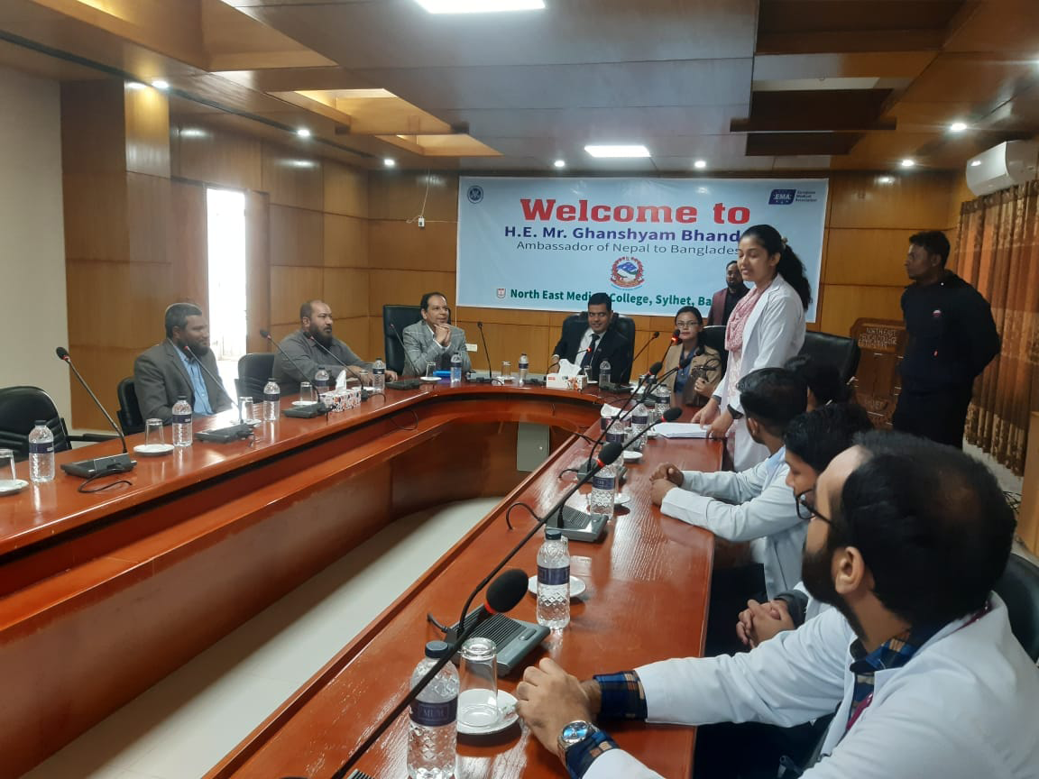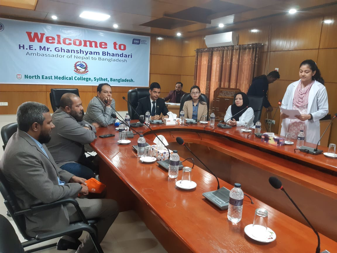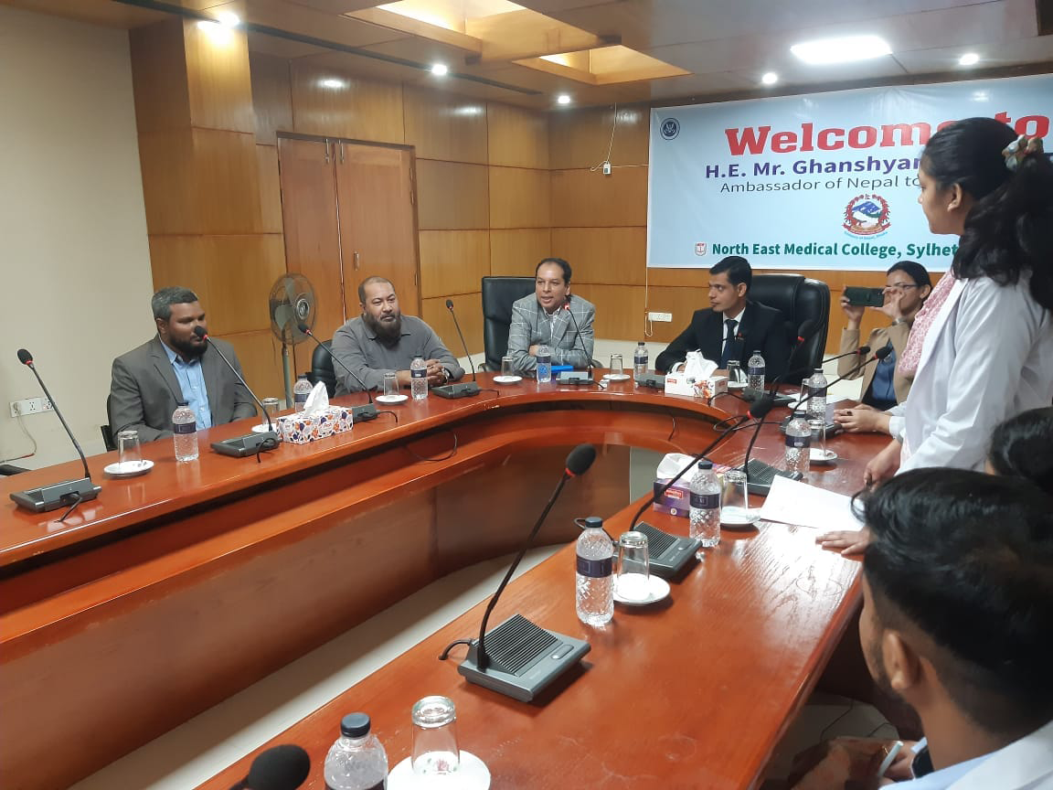 অদ্য ০৪.০২.২০২৪ইং তারিখে বাংলাদেশে নিযুক্ত নেপালের রাষ্ট্রদূত ঘানশ্যাম ভান্ডারি এর সাথে নর্থ ইষ্ট মেডিকেল কলেজ অধ্যক্ষ, শিক্ষকমন্ডলী ও নেপালী শিক্ষার্থীদের এক মতবিনিময় সভা অনুষ্ঠিত হয়। উক্ত মতবিনিময় সভা অত্যান্ত সৌহার্দ্যপূর্ণ ছিল। নেপালের রাষ্ট্রদূতের সাথে তাঁর সেকেন্ড সেক্রেটারী ইয়াজনা বাঞ্জান উপস্থিত ছিলেন। নেপালের রাষ্ট্রদূত নর্থ ইষ্ট মেডিকেল কলেজ এর আন্তরিকতা ও শিক্ষার মান নিয়ে সন্তোষ প্রকাশ করেন।