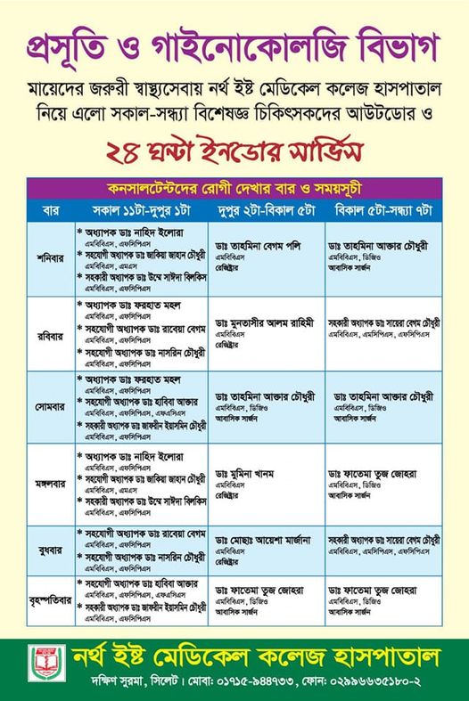 প্রসুতি ও গাইনোকোলজি বিভাগে মায়েদের জরুরী স্বাস্থ্যসেবায় নর্থ ইষ্ট মেডিকেল কলেজ হাসপাতাল নিয়ে এলো সকাল সন্ধ্যা বিশেষজ্ঞ চিকিৎসকদের সমন্বয়ে আউটডোর ও ২৪ ঘন্টা ইনডোর সার্ভিস।