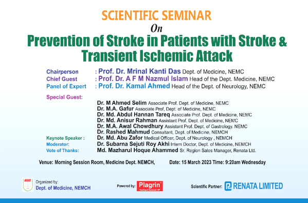 On 15th of March 2023 a scientific seminar about “PREVENTION OF STROKE IN PATIENTS WITH STROKE AND TRANSIENT ISCHEMIC ATTACK”was held at Department of Medicine North East Medical College & Hospital. Programs details were below: Chairperson: Prof.Dr Mrinal Kanti Das …