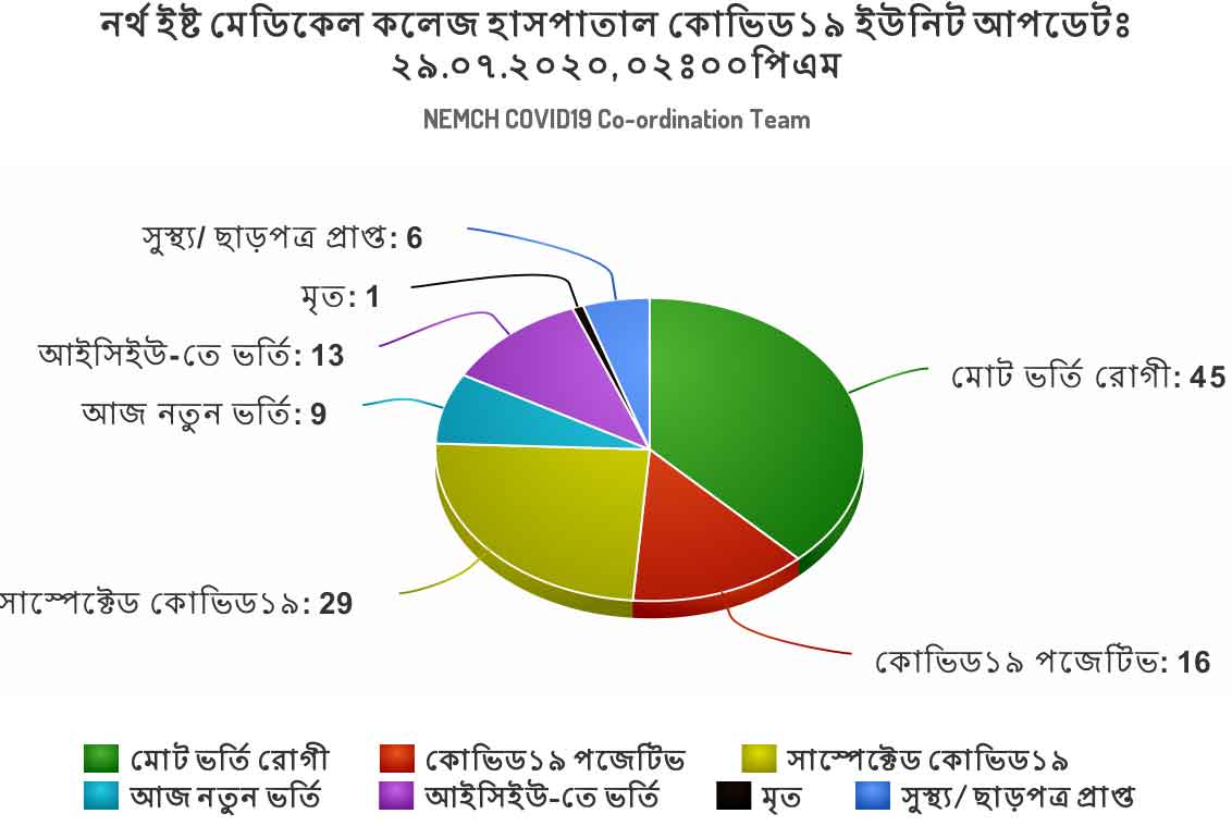 Total Patients Admitted: 45 Positive: 16 Suspected: 29 New Admission: 9 Total Dispatch/Discharged: 6 Death: 1 ICU: 13