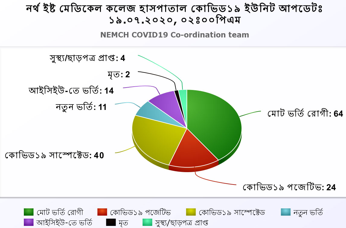Total Patient Admitted: 64 Positive: 16 Suspected: 48 New Admission: 10 Total Dispatch/Discharged: 7 Death: 2 ICU: 12