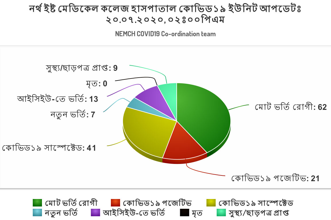 Total Patients Admitted: 62 Positive: 21 Suspected: 41 New Admission: 7 Total Dispatch/Discharged: 9 Death: 0 ICU: 13