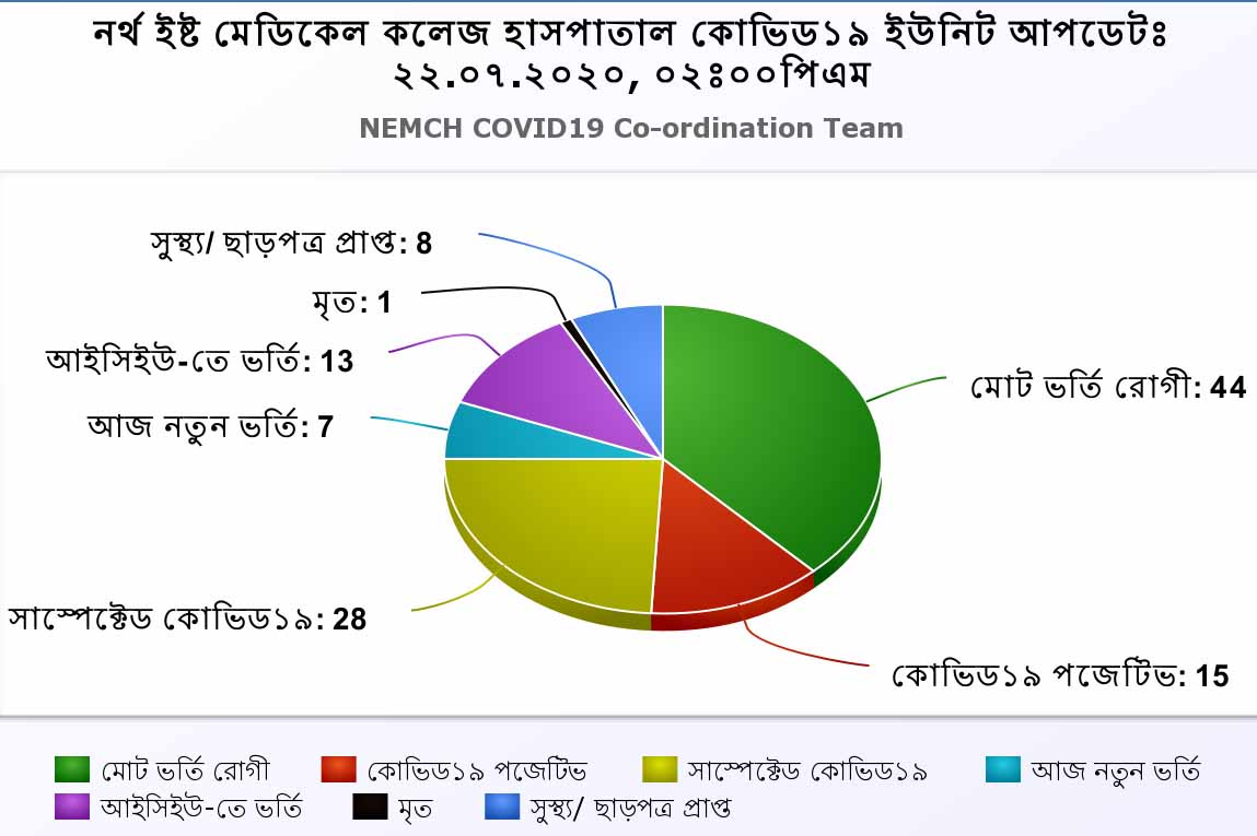 Total Patients Admitted: 44 Positive: 15 Suspected: 28 New Admission: 7 Total Dispatch/Discharged: 8 Death: 1 ICU: 13