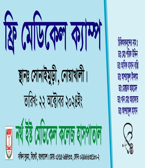 নর্থ ইষ্ট মেডিকেল কলেজ হাসপাতালের উদ্যোগে অদ্য ২২/১০/২০২৪ইং রোজ মঙ্গলবার দিনব্যাপী নোয়াখালী সোনাইমুরি উপজেলায় প্রায় ৬৫০ জন রোগীকে ঔষধ সহ বিনামুল্যে চিকিৎসা প্রদান করা হয়। নর্থ ইষ্ট মেডিকেল কলেজের চিকিৎসক বৃন্দের মধ্যে ডাঃ শরিফ উদ্দিন, ডাঃ আসিফ হাসান বাপ্পি, ডাঃ …