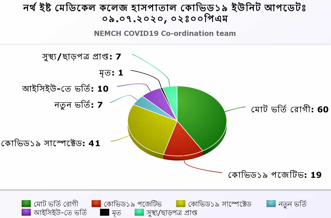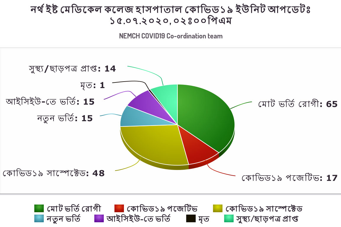 Total Patient Admitted: 63 Positive: 20 Suspected: 43 New Admission: 10 Total Dispatch/Discharged: 9 Death: 2 ICU: 14