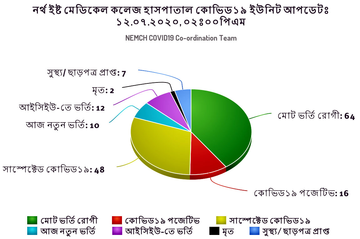 Total Patient Admitted: 64 Positive: 16 Suspected: 48 New Admission: 10 Total Dispatch/Discharged: 7 Death: 2 ICU: 12