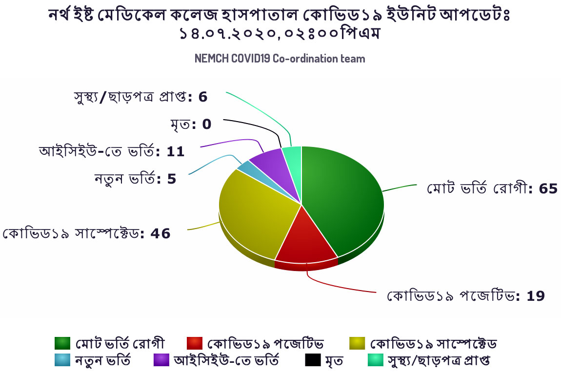 Total Patient Admitted: 64 Positive: 20 Suspected: 44 New Admission: 9 Total Dispatch/Discharged: 13 Death: 2 ICU: 14