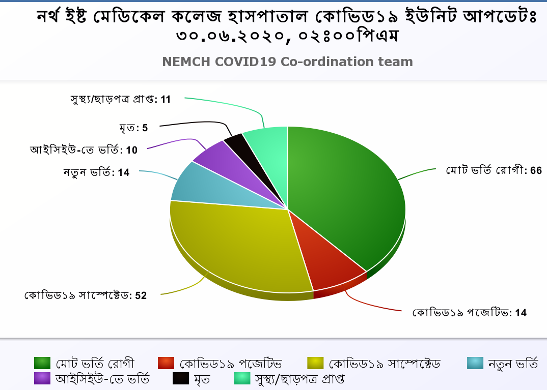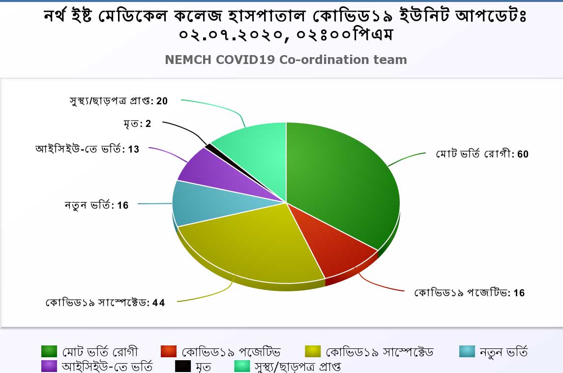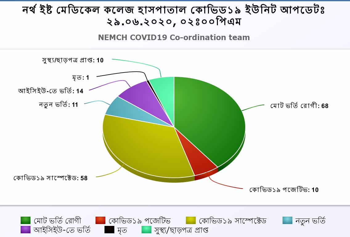 10.06.2020 at 10:00 am (Wednesday) Total Patient:34 7th Floor:10 (Suspected) 6th Floor:2 (Positive) 5th Floor: (ICU+HDU):10 (Suspected) 4th Floor (Cabin):12 (Suspected) New Admission:10 Total dispatch: (5) Discharged:4 Death:1 Particulars of the death: Ms. Abjuna Begum, Age-66 years, sex-Female,Address: …