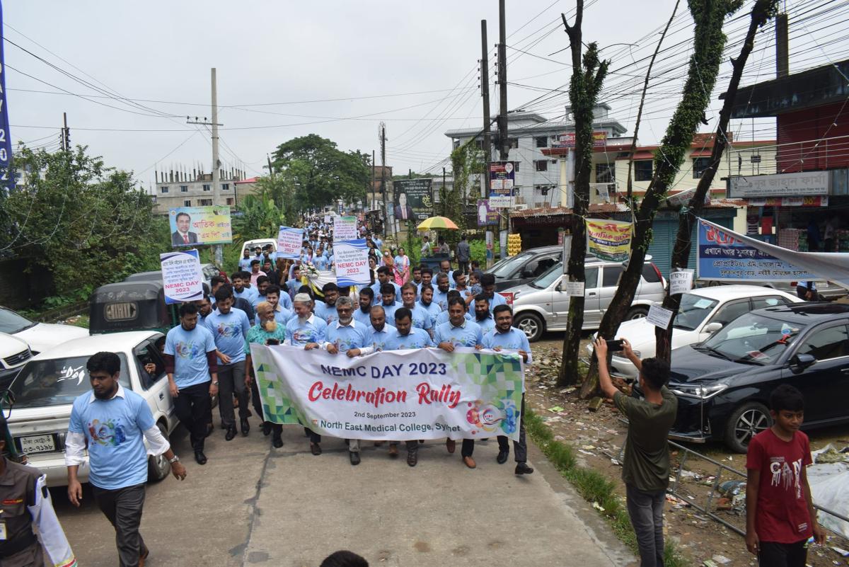 পরে কলেজের বর্তমান ও সাবেক শিক্ষার্থী এবং শিক্ষকমন্ডলীকে নিয়ে একটি বিশাল র্যালী চন্ডিপুল এলাকা প্রদক্ষিণ করে। র্যালী পরবর্তীতে কলেজ প্রাঙ্গনে নর্থ ইষ্ট মেডিকেল কলেজ ফটোগ্রাফিক সোসাইটির উদ্যোগে আলোকচিত্র প্রদর্শনীর উদ্ভোধন করা হয়। পরে কলেজের ফাহিম গ্যালারীতে এক আলোচনা সভা ও সায়েন্টিফিক সেমিনার অনুষ্টিত হয়। নর্থ ইষ্ট মেডিকেল কলেজের প্রিন্সিপাল ও ব্যবস্থাপনা পরিচালক প্রফেসর ডাক্তার শাহরিয়ার হোসেন চৌধুরীর সভাপতিত্বে ও ডাক্তার ওমর বিন আব্দুল আজিজ নাদিম এবং ডাক্তার পল্লবী চক্রবর্ত্তীর পরিচালনায় অনুষ্টানে প্রধান অতিথির বক্তব্যে প্রফেসর ডাক্তার মোহাম্মদ আফজাল মিয়া বলেন, জীবনে কোন কিছুই একার পক্ষে করা সম্ভব নয়। তেমনি সংশ্লিষ্ট সকলের সহযোগিতায় নর্থ ইষ্ট মেডিকেল কলেজ খুব কম সময়ে তার কাঙ্কিত লক্ষ্যে পৌছতে সম্ভব হয়েছে। শুরু থেকে এখন পর্যন্ত যারা এই কলেজের জন্য শ্রম এবং অর্থ দিয়েছেন তারা ইতিহাসের পাতায় অমর হয়ে থাকবেন উল্লেখ করে তিনি বলেন, নর্থ ইষ্ট মেডিকেল কলেজ বৃহত্তর সিলেটবাসীর জন্য চিকিৎসা সেবার ক্ষেত্রে মাইলফলক হয়ে থাকবে। জাতীয় ও আন্তর্জাতিক পর্যায়ে অনেকগুলো স্বীকৃতিসহ প্রতিষ্টানটি বেশ সুনাম অর্জন করেছে উল্লেখ করে ডাক্তার মোহাম্মদ আফজাল মিয়া বলেন, অদূর ভবিষ্যতে নর্থ ইষ্ট মেডিকেল কলজ বাংলাদেশের মধ্যে একটি অন্যতম কলেজে পরিণত হবে। এজন্য সকলের প্রচেষ্টা চালিয়ে যাওয়ার জন্য উদাত্ত আহ্বান জানান তিনি।