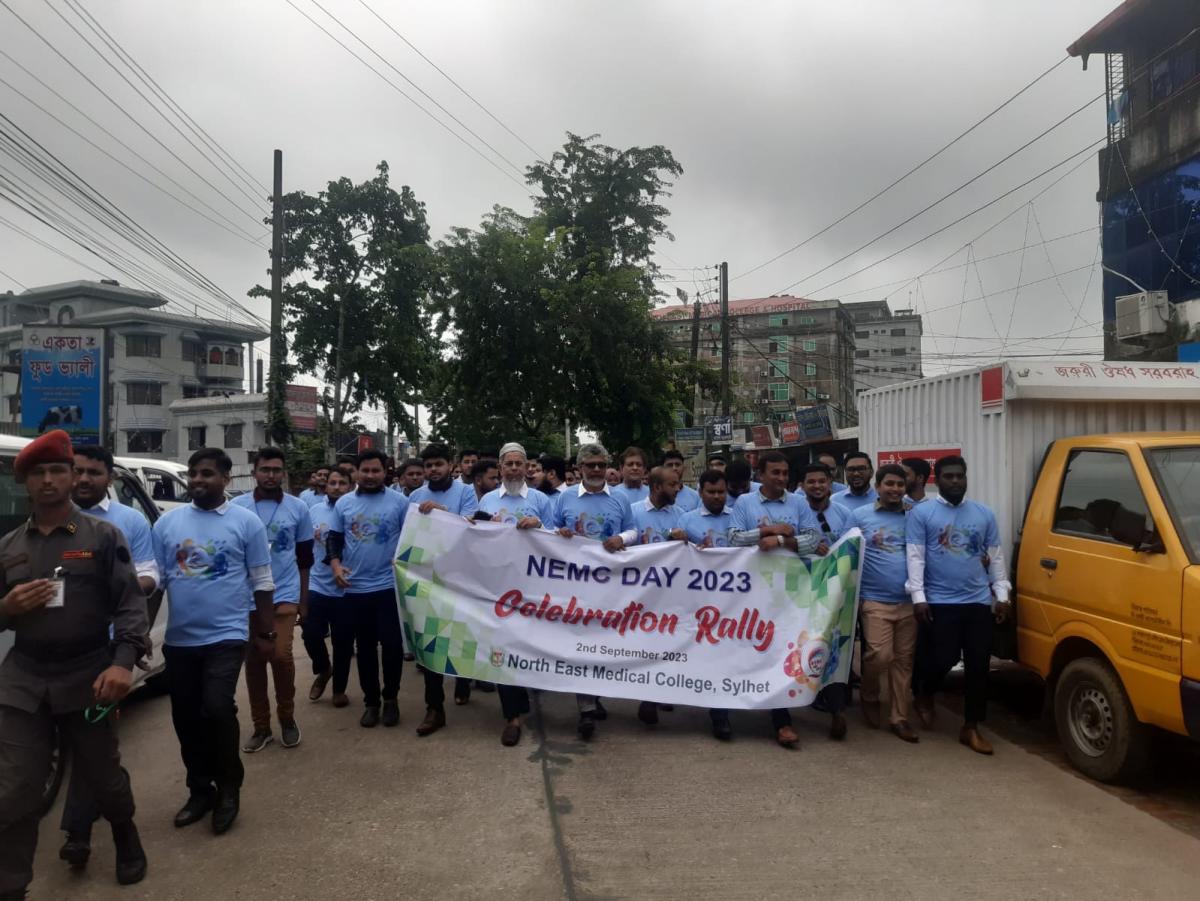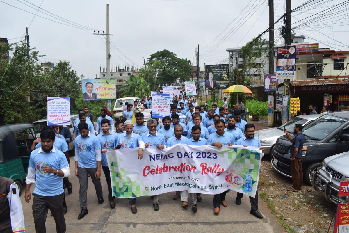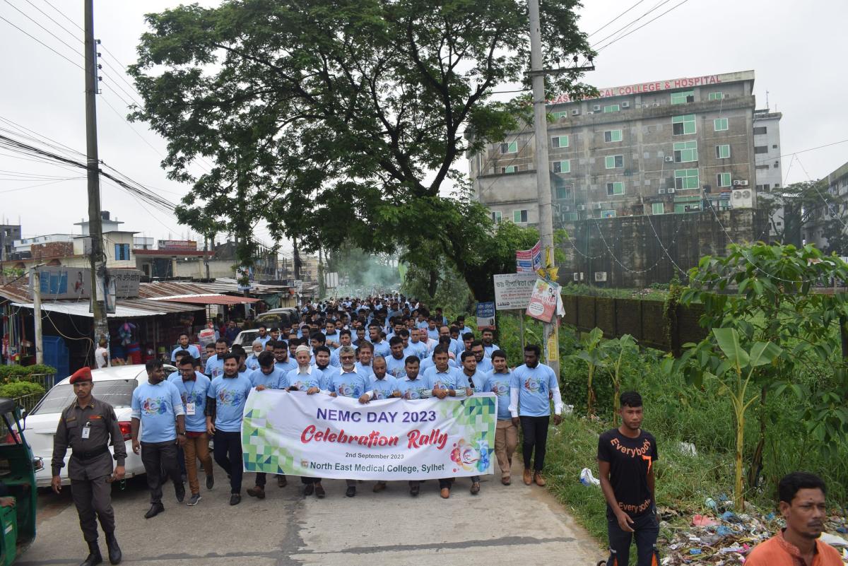 পরে কলেজের বর্তমান ও সাবেক শিক্ষার্থী এবং শিক্ষকমন্ডলীকে নিয়ে একটি বিশাল র্যালী চন্ডিপুল এলাকা প্রদক্ষিণ করে। র্যালী পরবর্তীতে কলেজ প্রাঙ্গনে নর্থ ইষ্ট মেডিকেল কলেজ ফটোগ্রাফিক সোসাইটির উদ্যোগে আলোকচিত্র প্রদর্শনীর উদ্ভোধন করা হয়। পরে কলেজের ফাহিম গ্যালারীতে এক আলোচনা সভা ও সায়েন্টিফিক সেমিনার অনুষ্টিত হয়। নর্থ ইষ্ট মেডিকেল কলেজের প্রিন্সিপাল ও ব্যবস্থাপনা পরিচালক প্রফেসর ডাক্তার শাহরিয়ার হোসেন চৌধুরীর সভাপতিত্বে ও ডাক্তার ওমর বিন আব্দুল আজিজ নাদিম এবং ডাক্তার পল্লবী চক্রবর্ত্তীর পরিচালনায় অনুষ্টানে প্রধান অতিথির বক্তব্যে প্রফেসর ডাক্তার মোহাম্মদ আফজাল মিয়া বলেন, জীবনে কোন কিছুই একার পক্ষে করা সম্ভব নয়। তেমনি সংশ্লিষ্ট সকলের সহযোগিতায় নর্থ ইষ্ট মেডিকেল কলেজ খুব কম সময়ে তার কাঙ্কিত লক্ষ্যে পৌছতে সম্ভব হয়েছে। শুরু থেকে এখন পর্যন্ত যারা এই কলেজের জন্য শ্রম এবং অর্থ দিয়েছেন তারা ইতিহাসের পাতায় অমর হয়ে থাকবেন উল্লেখ করে তিনি বলেন, নর্থ ইষ্ট মেডিকেল কলেজ বৃহত্তর সিলেটবাসীর জন্য চিকিৎসা সেবার ক্ষেত্রে মাইলফলক হয়ে থাকবে। জাতীয় ও আন্তর্জাতিক পর্যায়ে অনেকগুলো স্বীকৃতিসহ প্রতিষ্টানটি বেশ সুনাম অর্জন করেছে উল্লেখ করে ডাক্তার মোহাম্মদ আফজাল মিয়া বলেন, অদূর ভবিষ্যতে নর্থ ইষ্ট মেডিকেল কলজ বাংলাদেশের মধ্যে একটি অন্যতম কলেজে পরিণত হবে। এজন্য সকলের প্রচেষ্টা চালিয়ে যাওয়ার জন্য উদাত্ত আহ্বান জানান তিনি।
