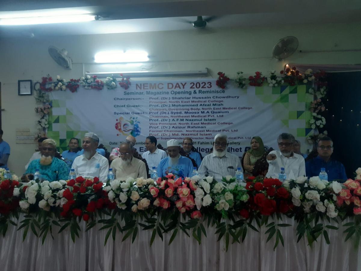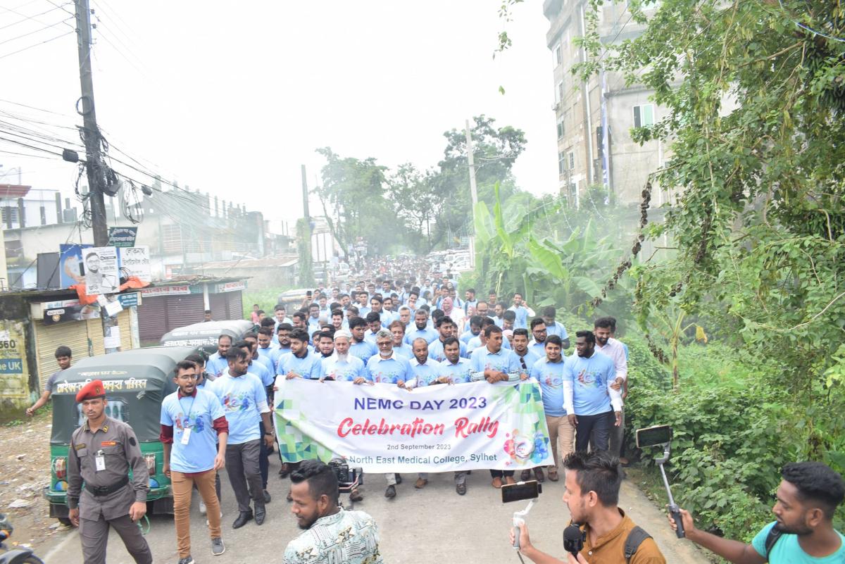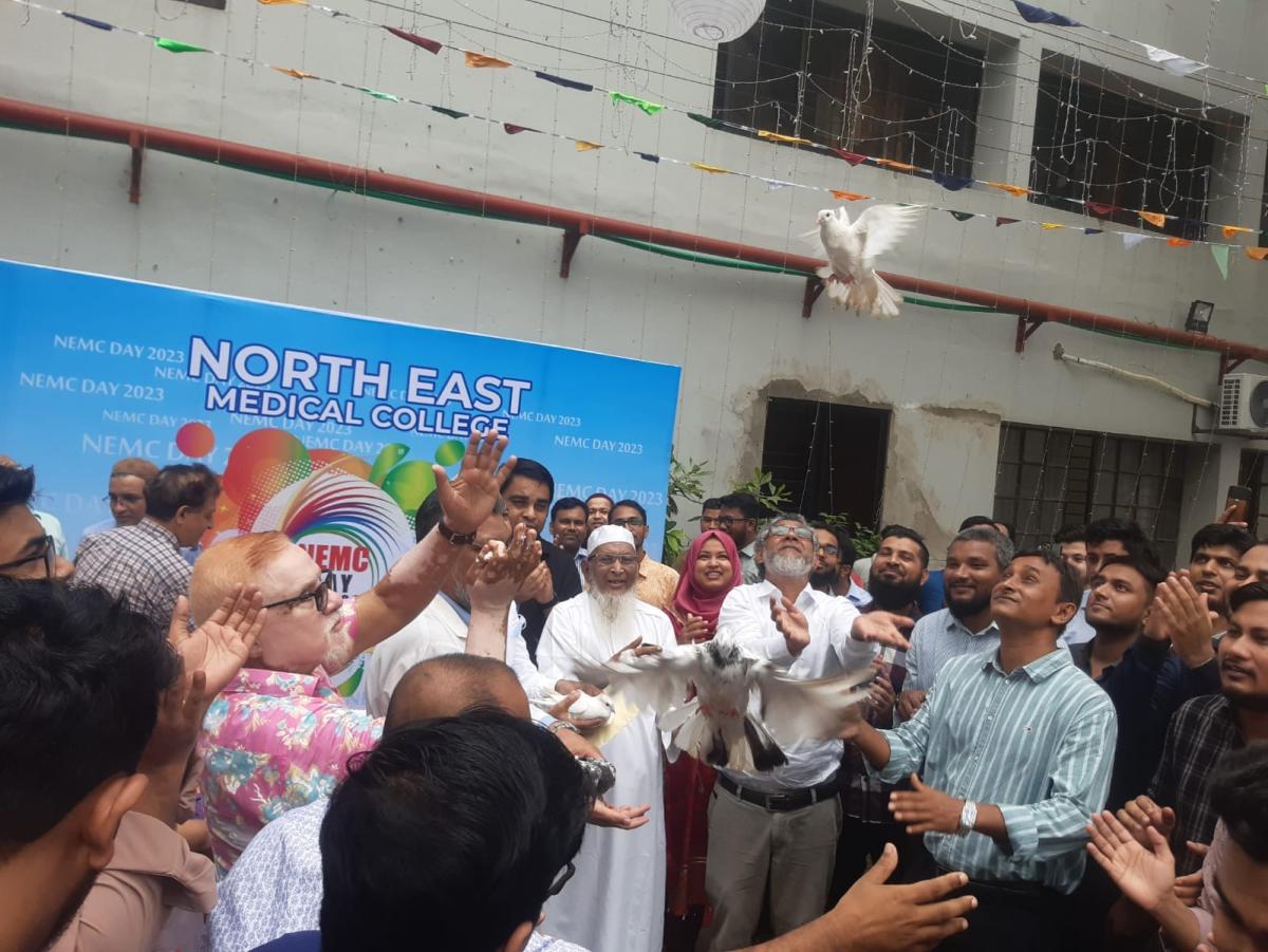 দিনব্যাপী ঝাঁকজমকপূর্ণ অনুষ্টানের মধ্য দিয়ে শনিবার (২ সেপ্টেম্বর) পালিত হয়েছে সিলেটের ঐতিহ্যবাহী প্রতিষ্টান নর্থ ইষ্ট মেডিকেল কলেজ ডে ২০২৩। প্রথমবারের মত দিনটি উপলক্ষে র্যালী, সেমিনারসহ বিভিন্ন রকম অনুষ্টানের আয়োজন করে কলেজটি। সকাল সাড়ে নয়টায় কেক কেটে এবং পায়রা উড়িয়ে অনুষ্টানের উদ্ভোধন করেন নর্থ ইষ্ট মেডিকেল কলেজ গভর্নিং বডির চেয়ারম্যান প্রফেসর ডাক্তার মোহাম্মদ আফজাল মিয়া, কলেজের প্রিন্সিপাল ও ব্যবস্থাপনা পরিচালক প্রফেসর ডাক্তার শাহরিয়ার হোসেন চৌধুরী, ভাইস প্রিন্সিপাল প্রফেসর ডাক্তার এ এফ এম নাজমুল ইসলাম, ডাক্তার মোঃ নাজমুল ইসলামসহ অতিথিবৃন্দ।