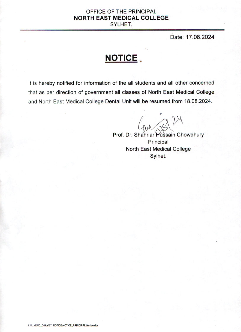 North East Medical College: Preparing for the Return to Learning. Posted by saheli_2018 Categories Notices Date August 17, 2024 Comments 0 comment Notice Principal saheli_2018 Previous post নর্থ ইষ্ট মেডিকেল কলেজ হাসপাতাল বৈষম্যবিরোধী ছাত্র আন্দোলনে যারা বিভিন্ন ভাবে আহত হয়েছেন সকলের সেবায় বদ্ধপরিকর। August 17, 2024 Next post On August 19, 2024, Continuing Medical Education (CME) seminar on "Obstetrical Anal Sphincter Injuries (OASI) during Vaginal Delivery." August 19, 2024 You may also like All the classes of North East Medical College Sylhet will remain suspended from 23rd June 2024 to 30th June 2024 on account of “Flood”. 20 June, 2024 Scientific Seminar On Update Management of Chronic Heart Failure. 25 May, 2024 SCIENTIFIC SEMINAR ON 29.04.2024, Monday at 8.30 A.M to 09.30 AM. 27 April, 2024