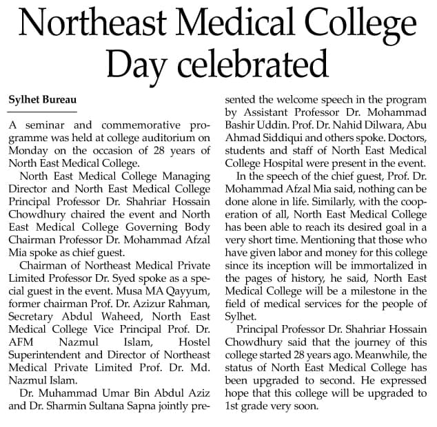 Northeast Medical College Day Celebrated. Posted by saheli_2018 Categories News, recent Date September 5, 2024 Comments 0 comment NEMC1 NEMC2 saheli_2018 Previous post বন্যা কবলিত এলাকায় বিভাগীয় প্রেসক্লাব, সিলেট এর উদ্যোগে ফ্রি মেডিকেল ক্যাম্প। September 5, 2024 Next post ফ্রি মেডিকেল ক্যাম্প ও ত্রাণ বিতরন । September 5, 2024 You may also like “Aspects of Bone Marrow Transplant in Bangladesh: Present and Future” 5 November, 2024 DAY-LONG TRAINING ON CUSTOMER COMMUNICATION & CLIENT SERVICE EXCELLENCE. 2 November, 2024 নর্থ ইষ্ট মেডিকেল কলেজ হাসপাতালের সেচ্ছাসেবী রক্তদাতা সংগঠন *জীবন* এর ভ্যক্সিনেশন প্রোগ্রাম। 30 October, 2024