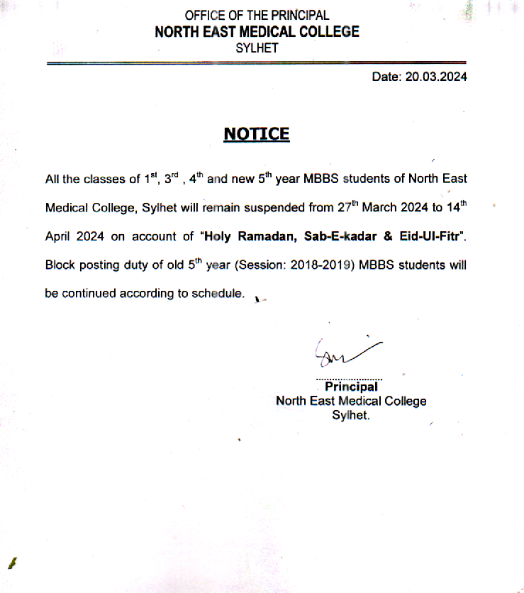 Recent Notice MBBS Students of North East Medical College, Sylhet. Posted by saheli_2018 Categories Notices, recent Date March 20, 2024 Comments 0 comment 06.04 saheli_2018 Previous post জাতির পিতা বঙ্গবন্ধু শেখ মুজিবুর রহমান এর ১০৪ তম জন্ম বার্ষিকী ও জাতীয় শিশু দিবেস ২০২৪ উদযাপন। March 20, 2024 Next post ফাইনাল পেশাগত এমবিবিএস পরীক্ষা নভেম্বর-২০২২ইং, ফলাফল প্রকাশের তারিখঃ২৭-১১-২০২৩ইং March 20, 2024 You may also like “Aspects of Bone Marrow Transplant in Bangladesh: Present and Future” 5 November, 2024 DAY-LONG TRAINING ON CUSTOMER COMMUNICATION & CLIENT SERVICE EXCELLENCE. 2 November, 2024 নর্থ ইষ্ট মেডিকেল কলেজ হাসপাতালের সেচ্ছাসেবী রক্তদাতা সংগঠন *জীবন* এর ভ্যক্সিনেশন প্রোগ্রাম। 30 October, 2024
