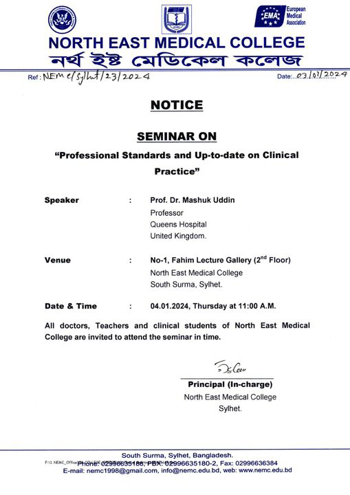 Seminar on Professional Standards and Up-to-date on Clinical Practice Posted by saheli_2018 Categories new, News, recent Date January 3, 2024 Comments 0 comment saheli_2018 Previous post শীত-বস্ত্র বিতরণ কর্মসুচি নর্থ ইষ্ট মেডিকেল কলেজ । January 3, 2024 Next post Journal Presentation by Dr. Abdul Aziz Abdullah. January 15, 2024 You may also like “Aspects of Bone Marrow Transplant in Bangladesh: Present and Future” 5 November, 2024 DAY-LONG TRAINING ON CUSTOMER COMMUNICATION & CLIENT SERVICE EXCELLENCE. 2 November, 2024 নর্থ ইষ্ট মেডিকেল কলেজ হাসপাতালের সেচ্ছাসেবী রক্তদাতা সংগঠন *জীবন* এর ভ্যক্সিনেশন প্রোগ্রাম। 30 October, 2024